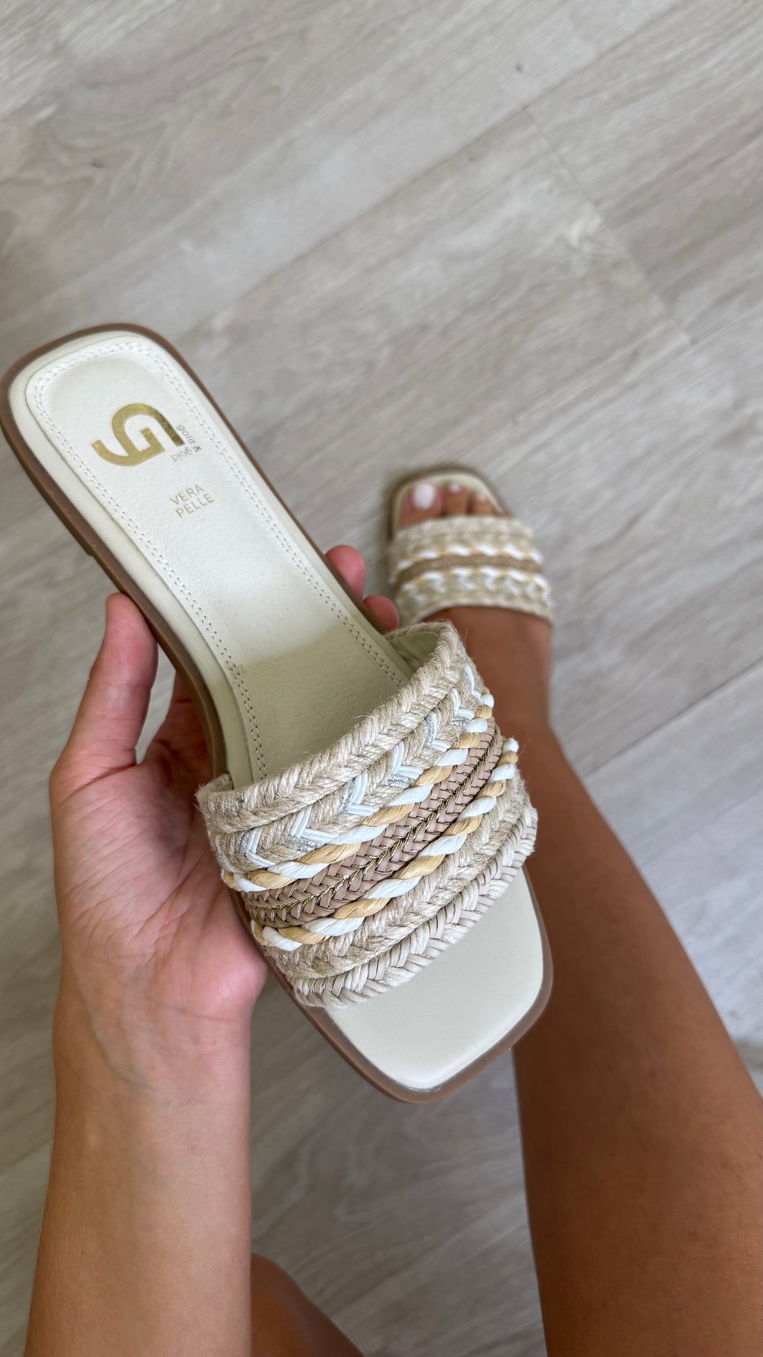 Ciabatta con fascia in corda e con suola in gomma. calzata regolare plantare in vera pelle