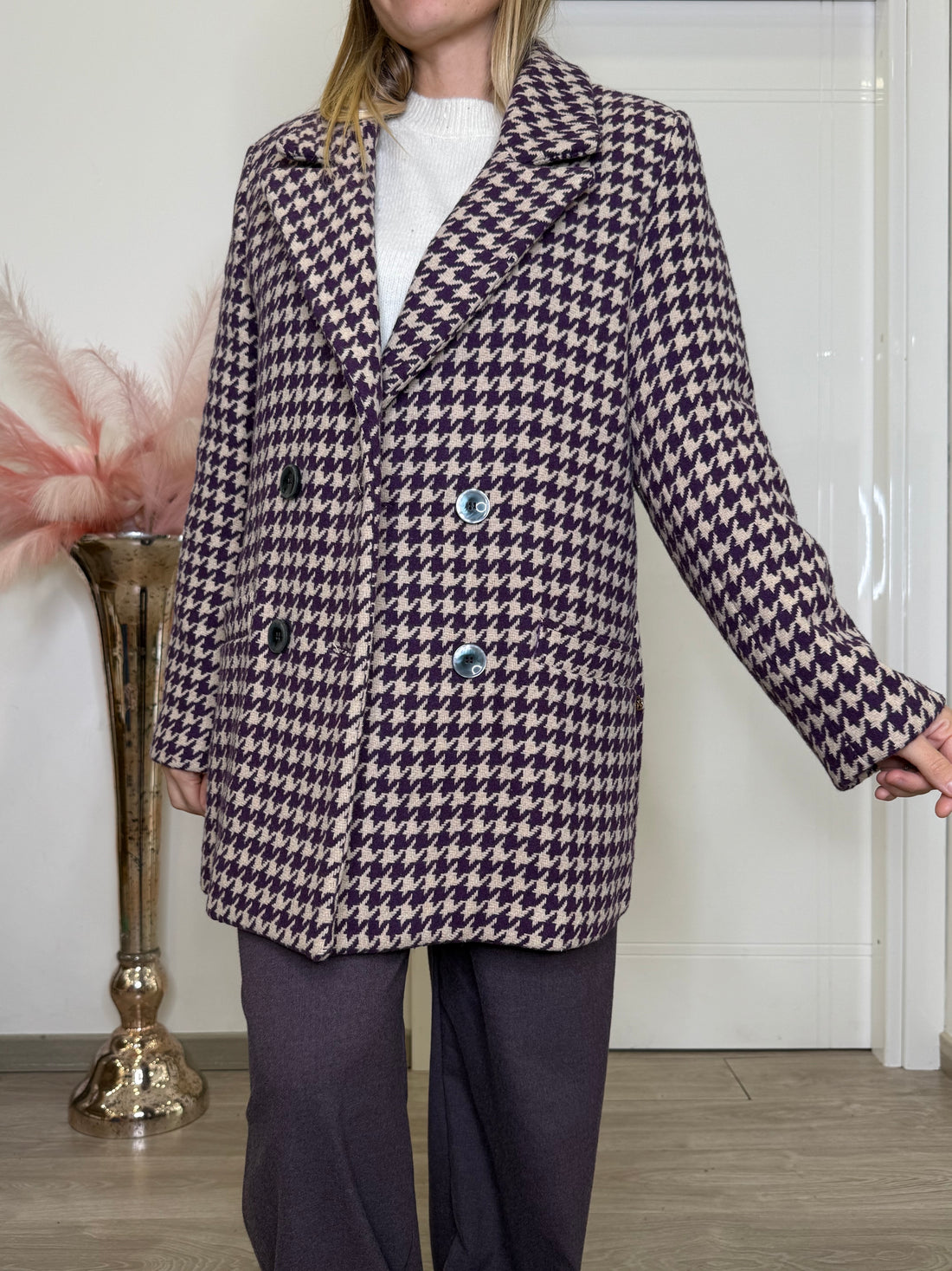 Cappotto in fantasia panna e viola. Doppio petto