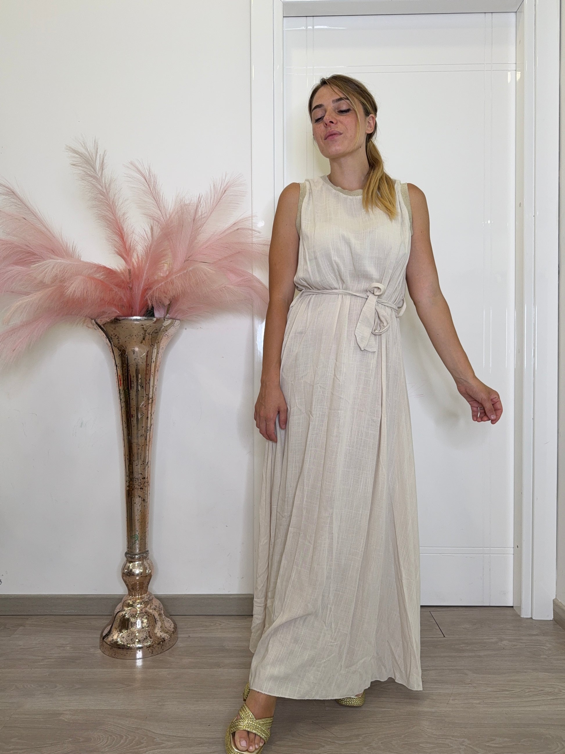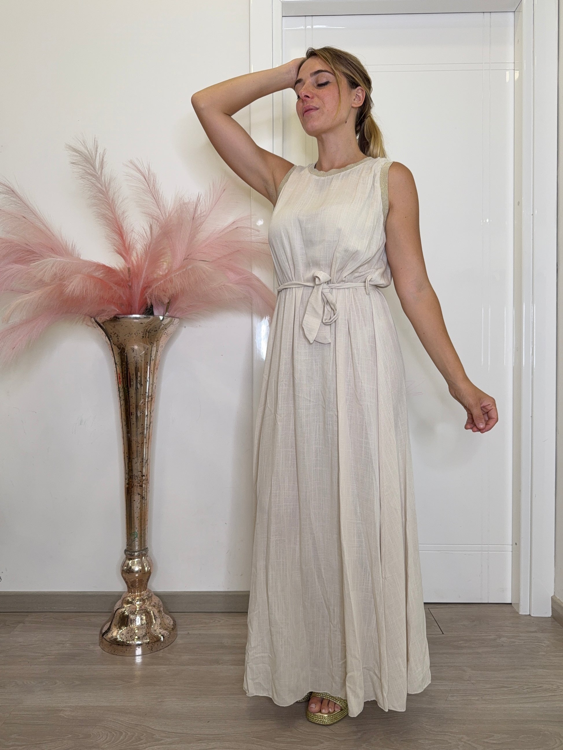 Vestito con cintura in tessuto sul punto vita . Giro manica con dettaglio in molla oro . Vestito scivoloso non aderisce cotone super leggero