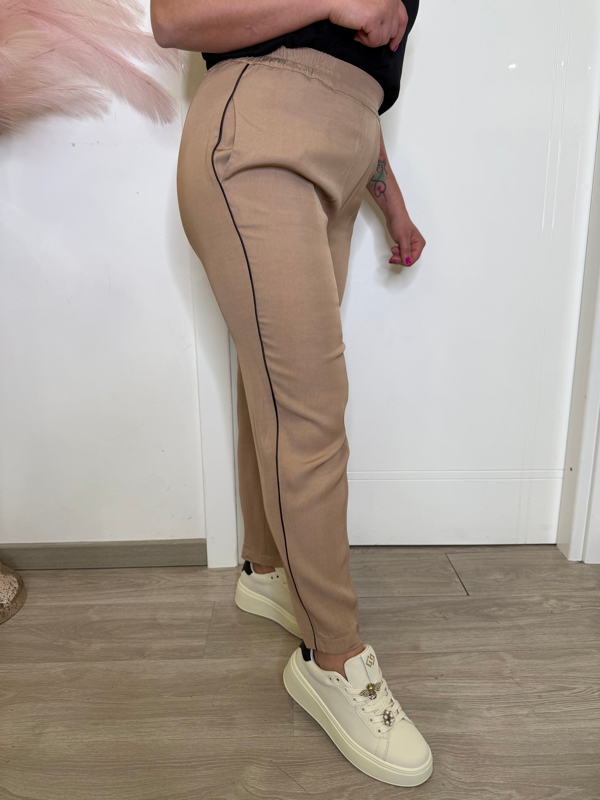 Pantalone in cotone con tasca a filo con riga laterale. Modello con elastico in vita