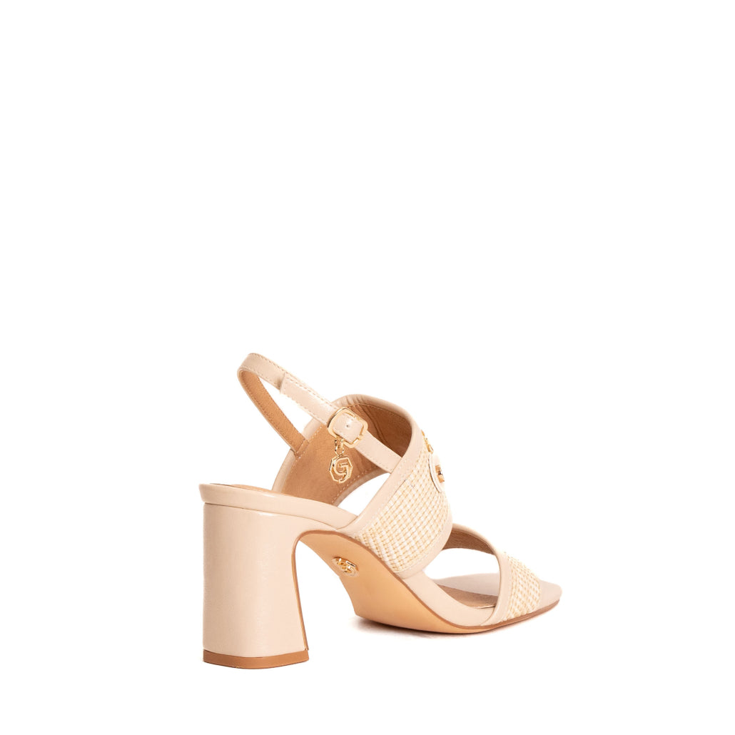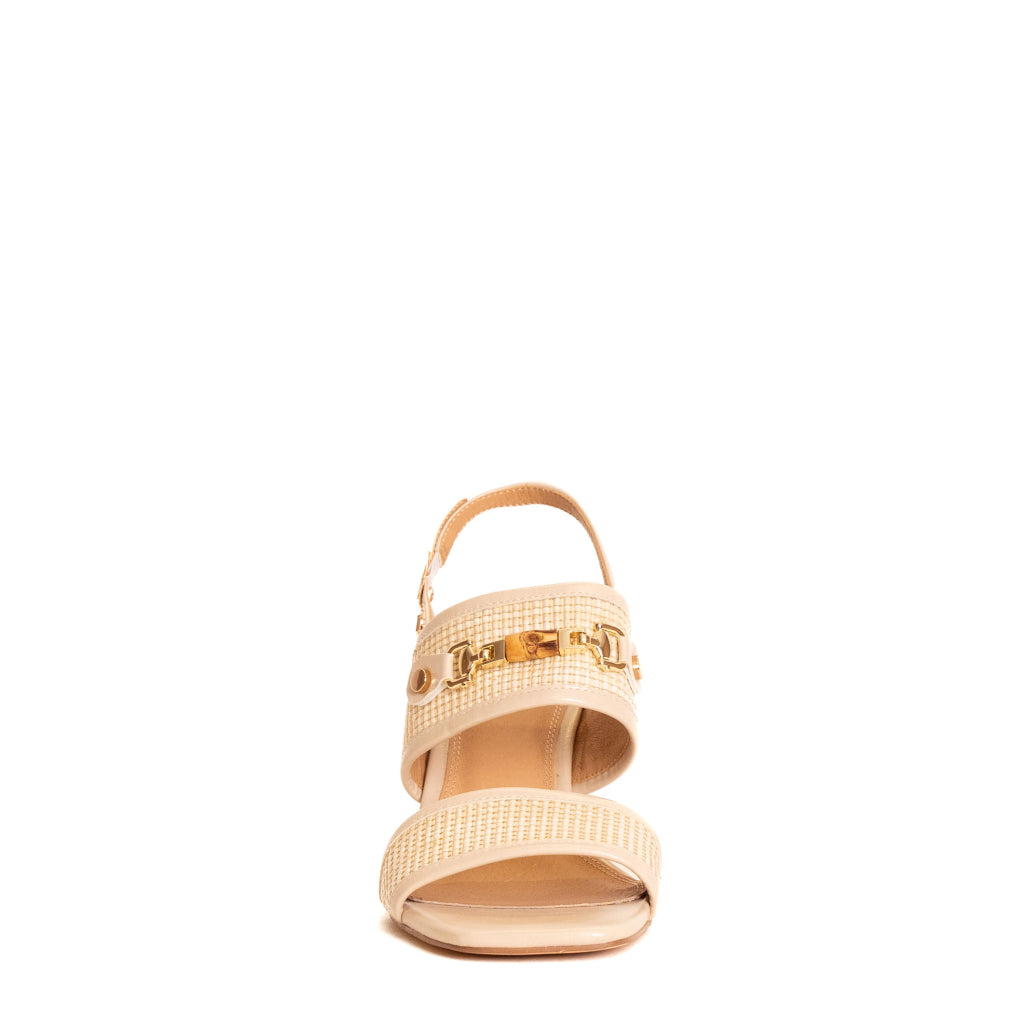 Sandalo in paglia con dettaglio in legno. Tacco comodo 8 cm